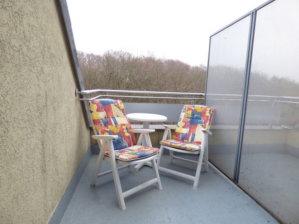 Balkon: 2 fotele balkonowe, 1 leżak, stolik, strona wschodnia, widok na park