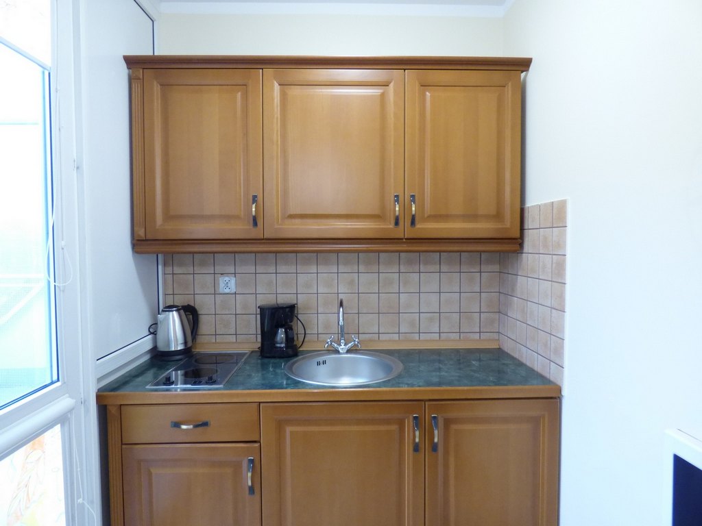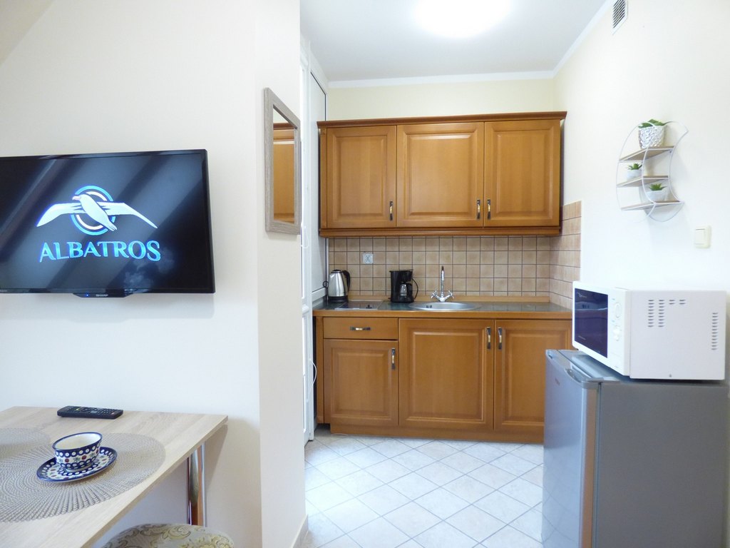 Kuchnia: płyta ceramiczna 2-palnikowa, lodówka, kuchenka mikrofalowa, czajnik, ekspres do kawy, zlewozmywak 1-komorowy, garnki, naczynia, sztućce