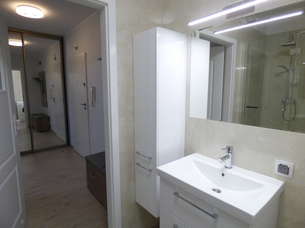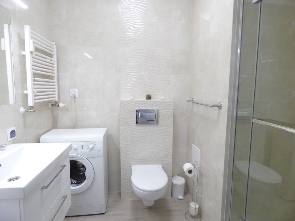 Łazienka: kabina prysznicowa, sedes, umywalka, pralka, szafka łazienkowa;