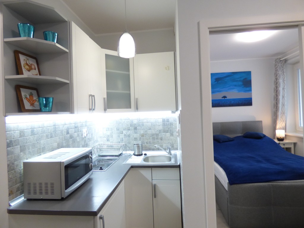 Kuchnia: płyta ceramiczna 2-palnikowa, zlewozmywak 1-komorowy, lodówka podblatowa, czajnik, kuchenka mikrofalowa, garnki, naczynia, sztućce;
