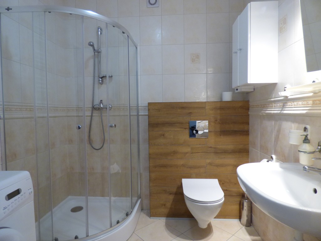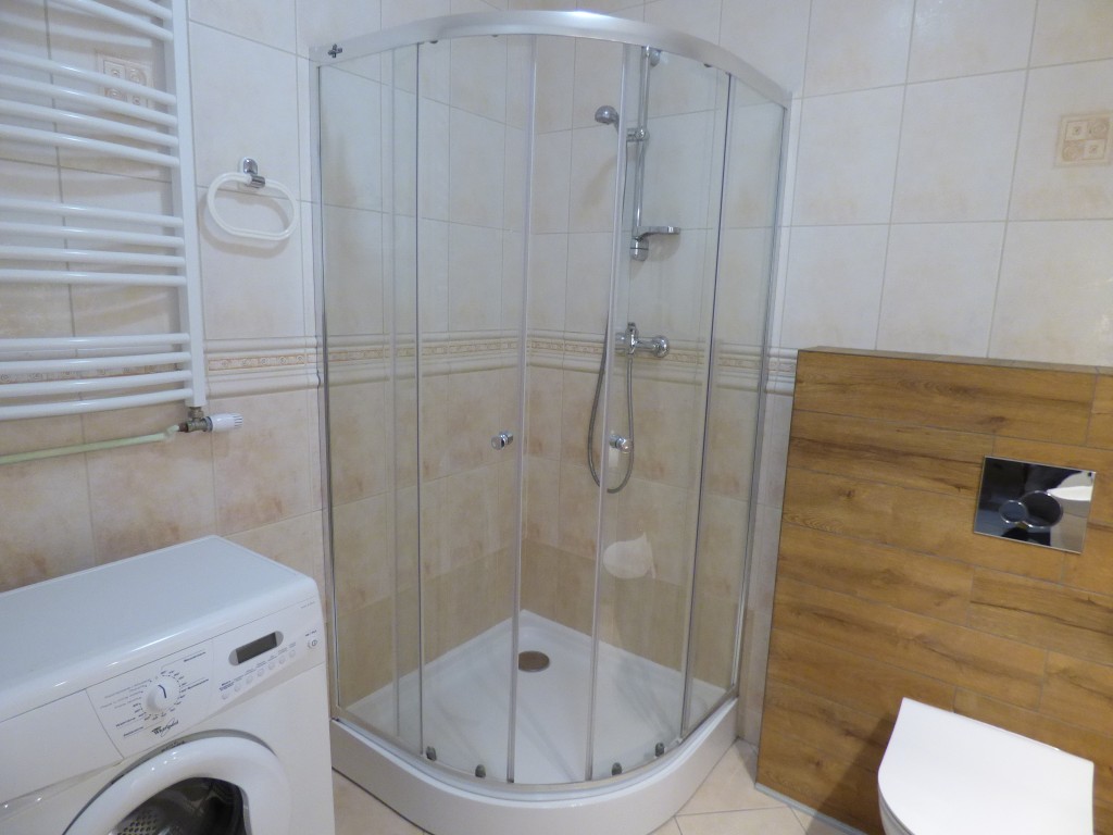 Łazienka: kabina prysznicowa, umywalka, sedes, pralka;