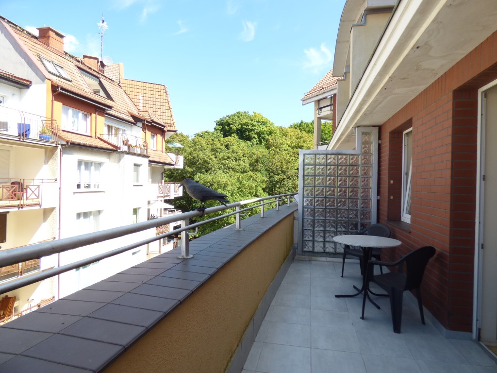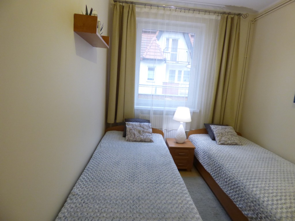 ul. Obrońców Westerplatte, III piętro z windą, z bardzo dużym balkonem, widok na pasaż pieszy między ulicą Obrońców Westerplatte i Towarową. Do spania narożnik 2-osobowy w dużym pokoju oraz dwa łóżka pojedyncze w sypialni. Mniejszy pokój zamykany. Mieszkanie o powierzchni 38m2. W oknach rolety wewnętrzne, firany i zasłony.