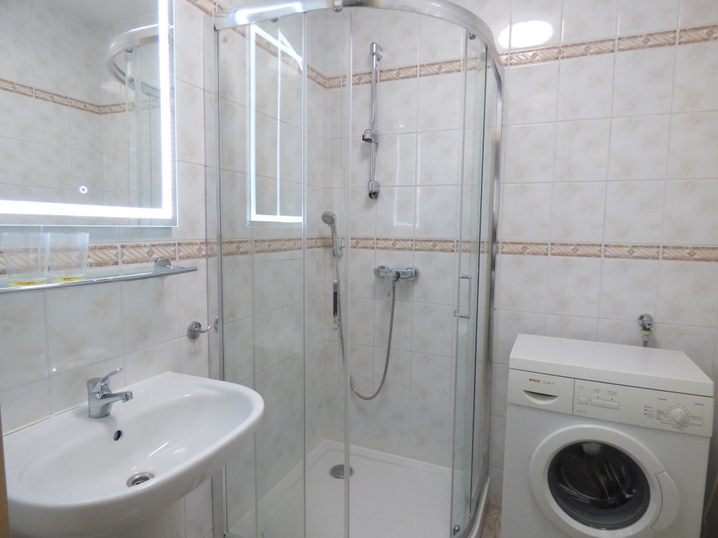 Łazienka: kabina prysznicowa, umywalka, regał łazienkowy, pralka;