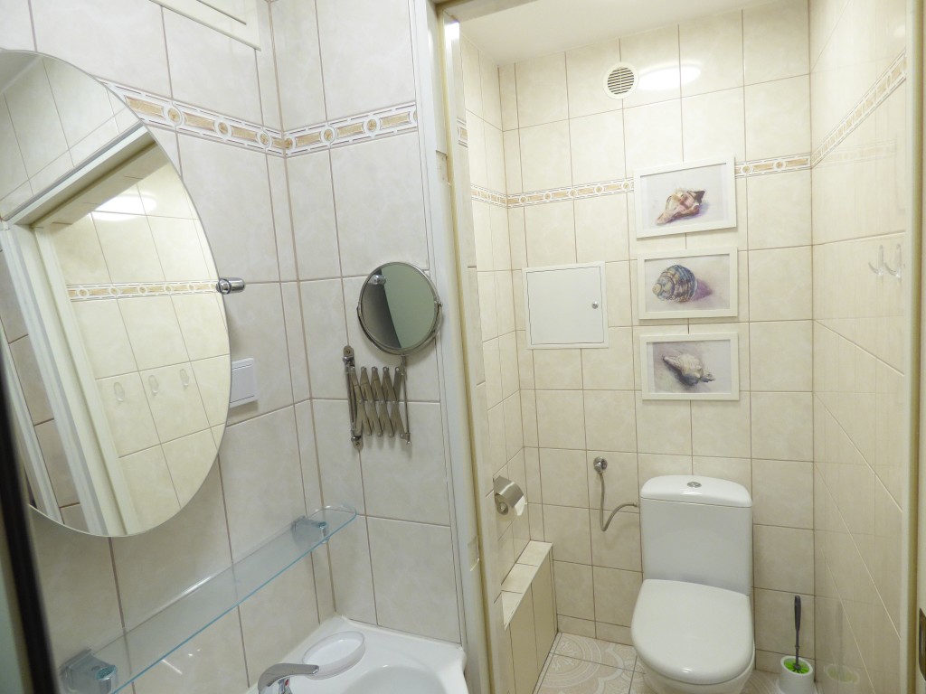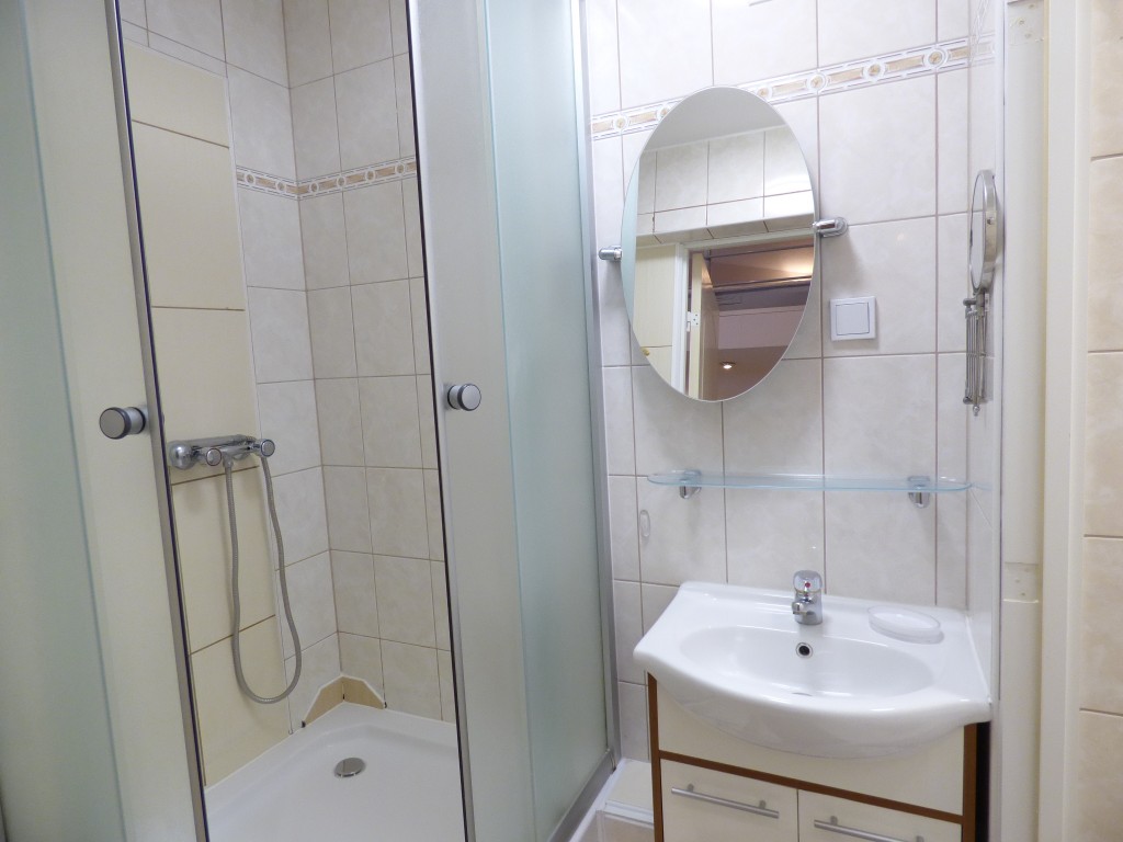 Łazienka: kabina prysznicowa, umywalka, sedes;