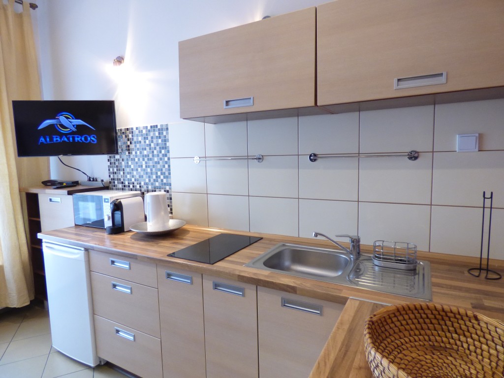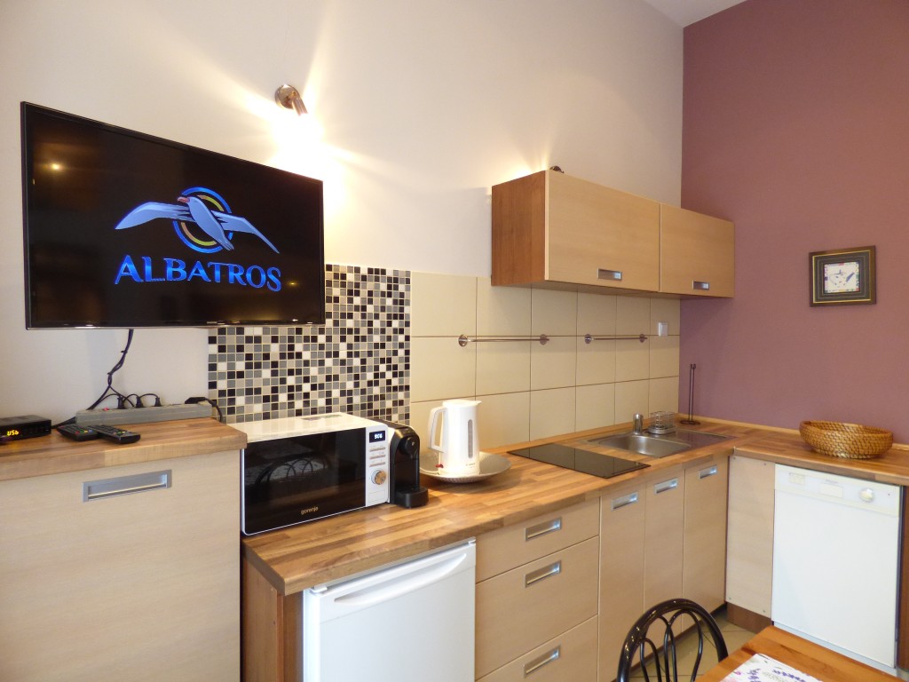 Kuchnia: płyta ceramiczna 2-palnikowa, zlewozmywak 1-komorowy, lodówka podblatowa, kuchenka mikrofalowa, czajnik, ekpres do kawy kapsułkowy, toster, garnki, naczynia, sztućce, stół, 4 krzesła, TV LED 32” THOMSON na uchwycie ściennym (programy naziemne DVB-T);