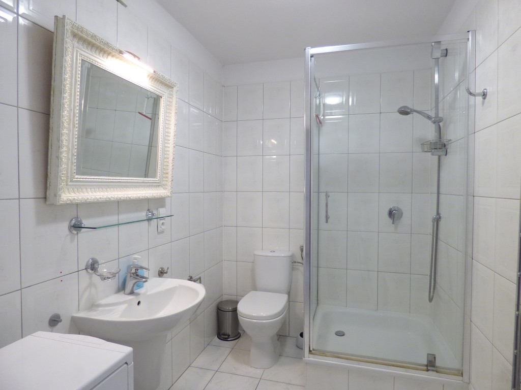 Łazienka: kabina prysznicowa, umywalka, sedes, szafka łazienkowa, pralka;