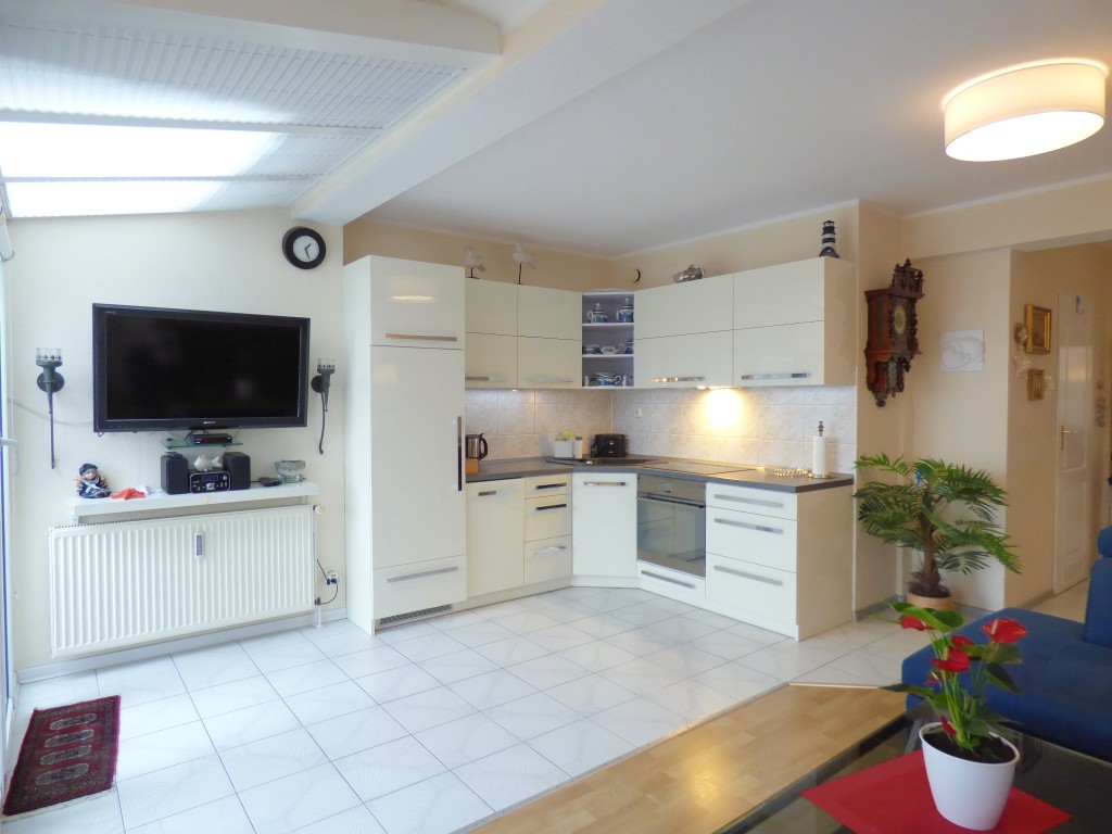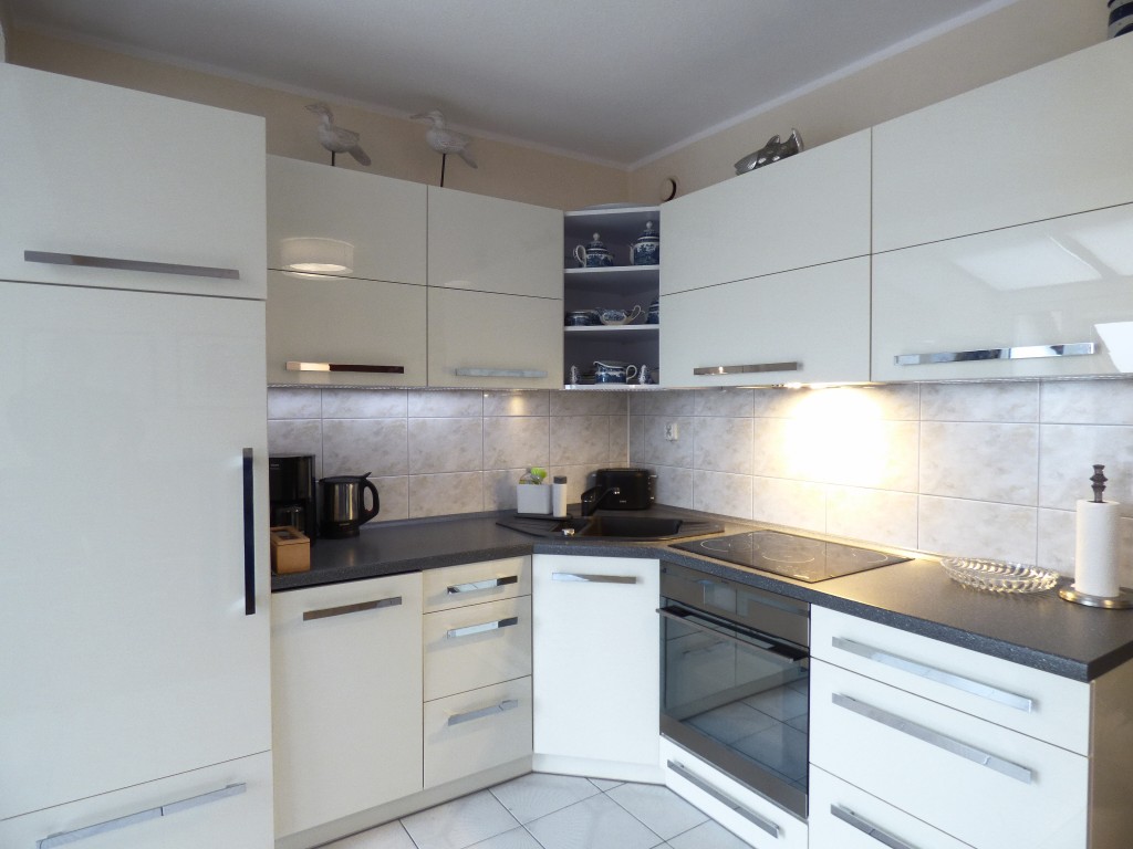 Kuchnia: płyta elektryczna 4-palnikowa, piekarnik, okap kuchenny, kuchenka mikrofalowa, zlewozmywak 1-komorowy, lodówka, zmywarka do naczyń, czajnik, ekspres do kawy przelewowy, garnki, naczynia, sztućce, stół, 4 krzesła;
