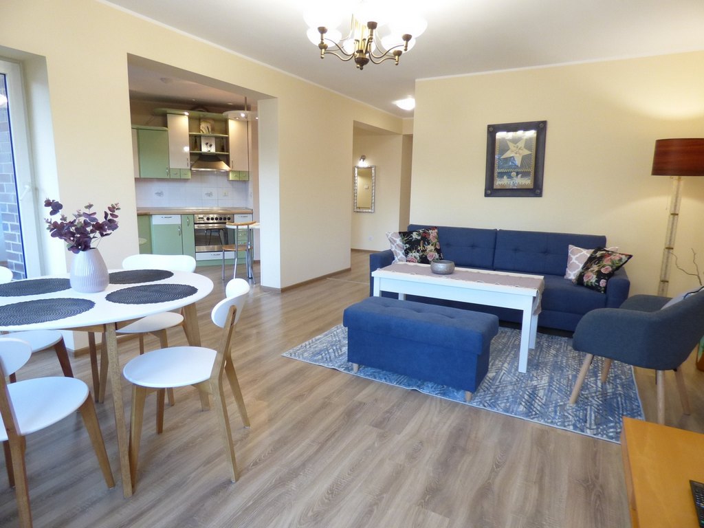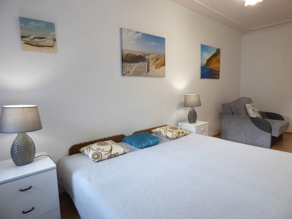 ul. Morska, I piętro bez windy, dwa balkony: od strony morza i od strony południowej. Do spania łoże małżeńskie w jednej sypialni oraz dwa połączone łóżka w drugiej sypialni (z możliwością rozdzielenia). Sypialnie zamykane, nieprzechodnie. Mieszkanie o powierzchni 80m2.
