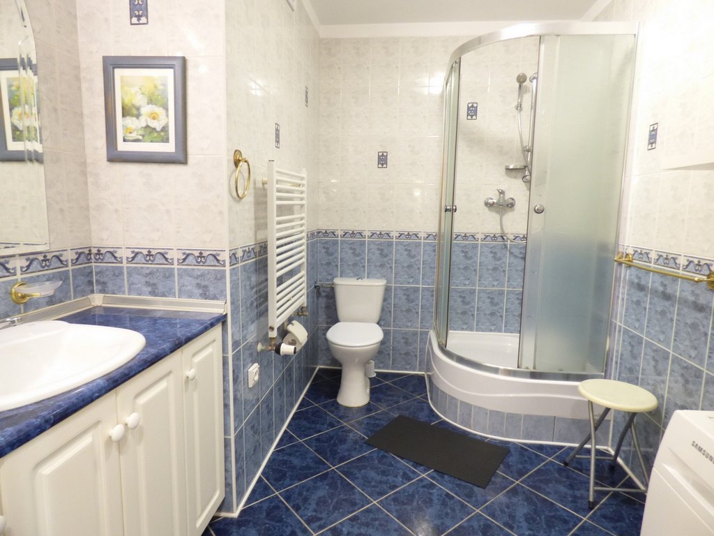 Łazienka: kabina prysznicowa, sedes, umywalka, szafka łazienkowa, pralka;