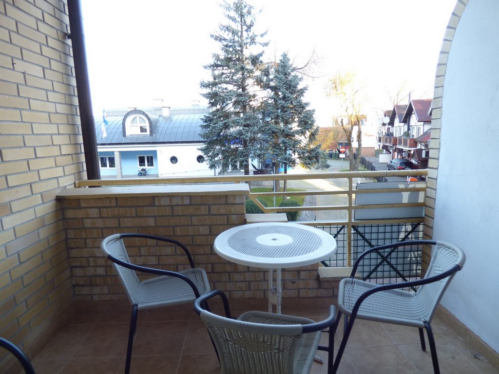 Balkon od strony północnej, wejście od strony kuchni: stolik, 4 krzesła, suszarka do bielizny, 1 leżak, balkon od strony południowej: wejście z obu sypialni;