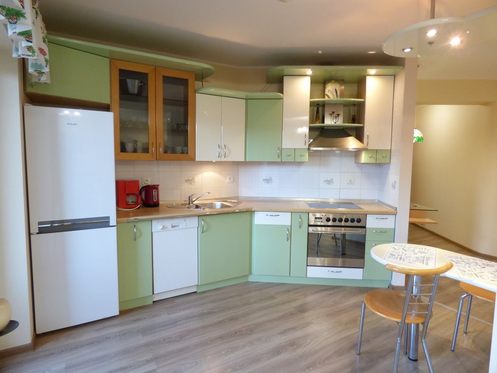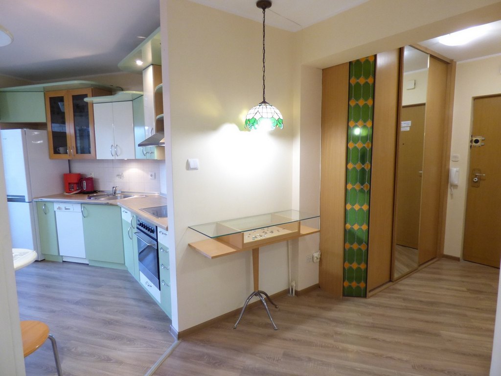 Kuchnia: płyta ceramiczna 4-palnikowa, piekarnik, okap kuchenny, zlewozmywak 1-komorowy, lodówka, czajnik, ekspres do kawy przelewowy, garnki, naczynia, sztućce, stół w formie blatu zabudowanego, 3 krzesła