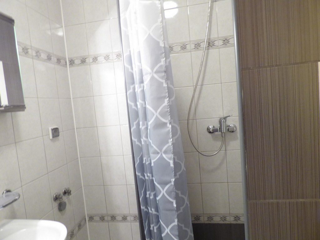 Łazienka: kabina prysznicowa, umywalka, sedes, suszarka na bieliznę;