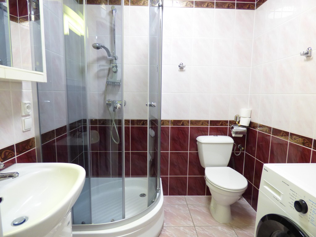 Łazienka: kabina prysznicowa, umywalka, sedes, pralka;