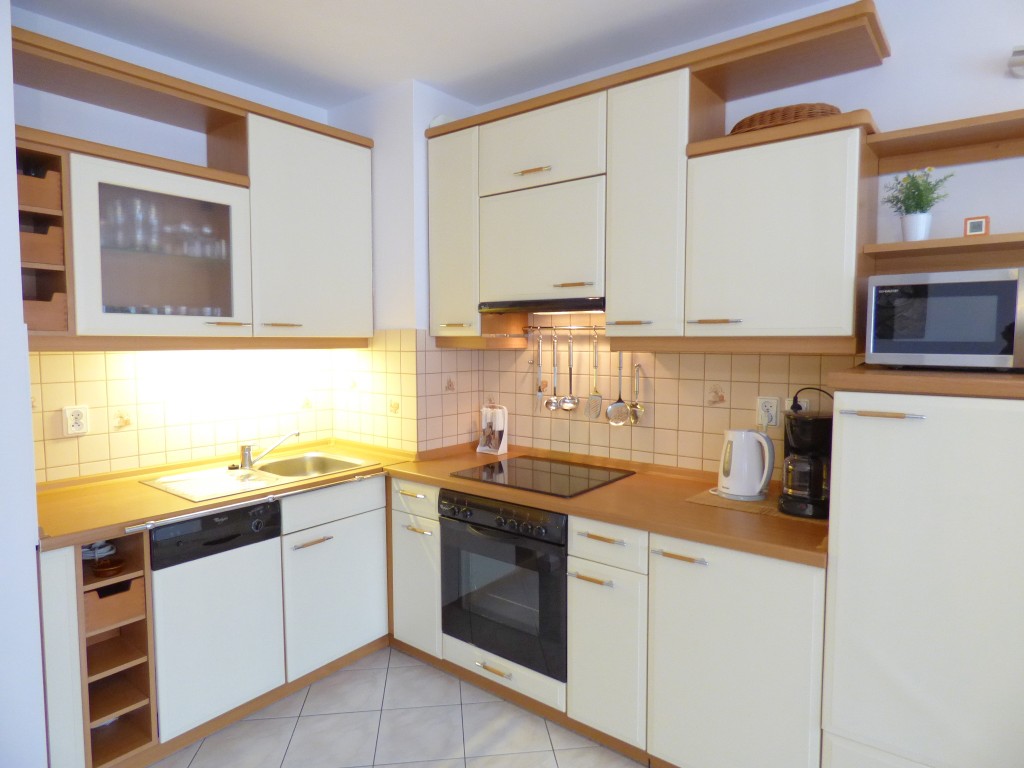 Kuchnia: płyta ceramiczna 4-palnikowa, piekarnik, zmywarka do naczyń, okap kuchenny, zlewozmywak 1-komorowy, lodówka, kuchenka mikrofalowa, czajnik, garnki, naczynia, sztućce;